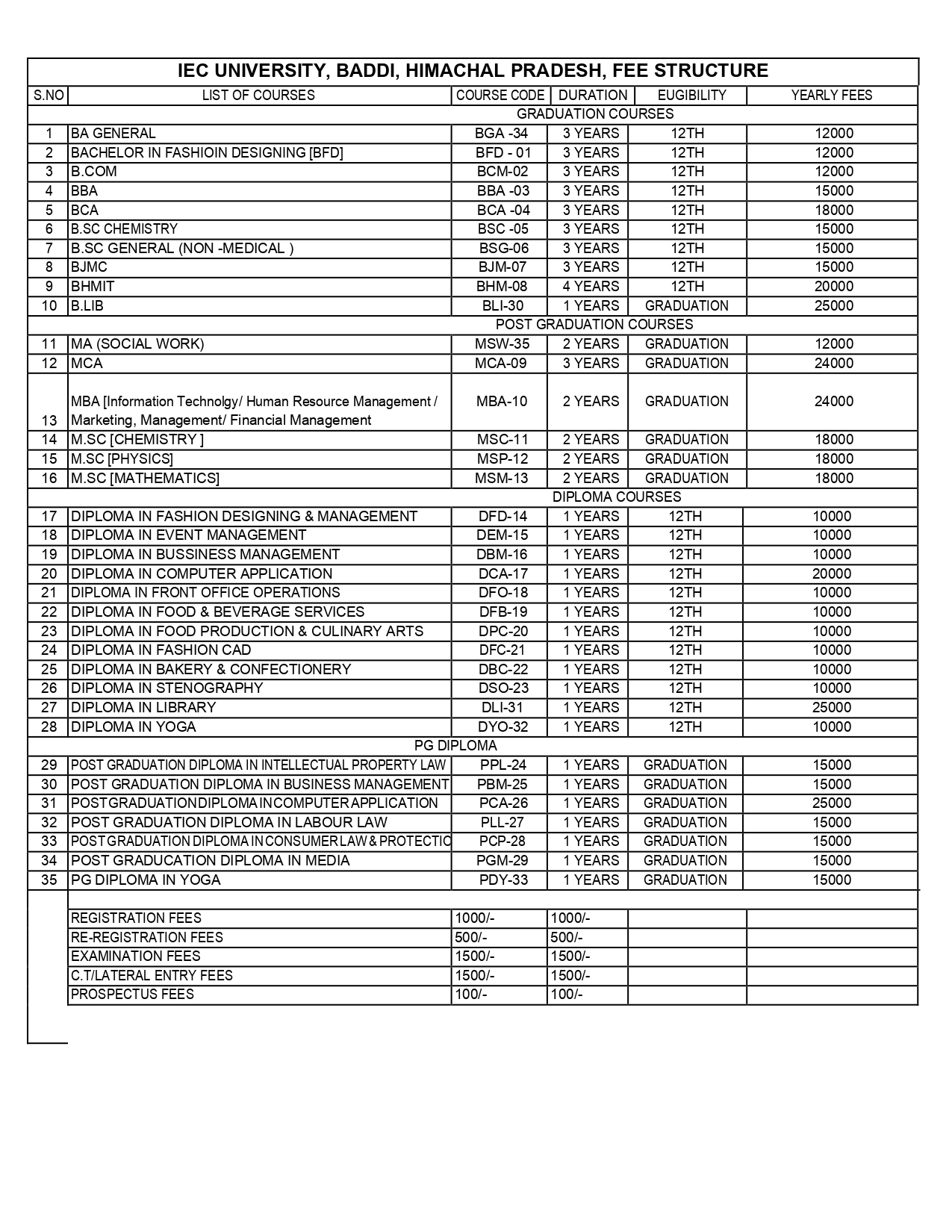 Course wise Fee Structure