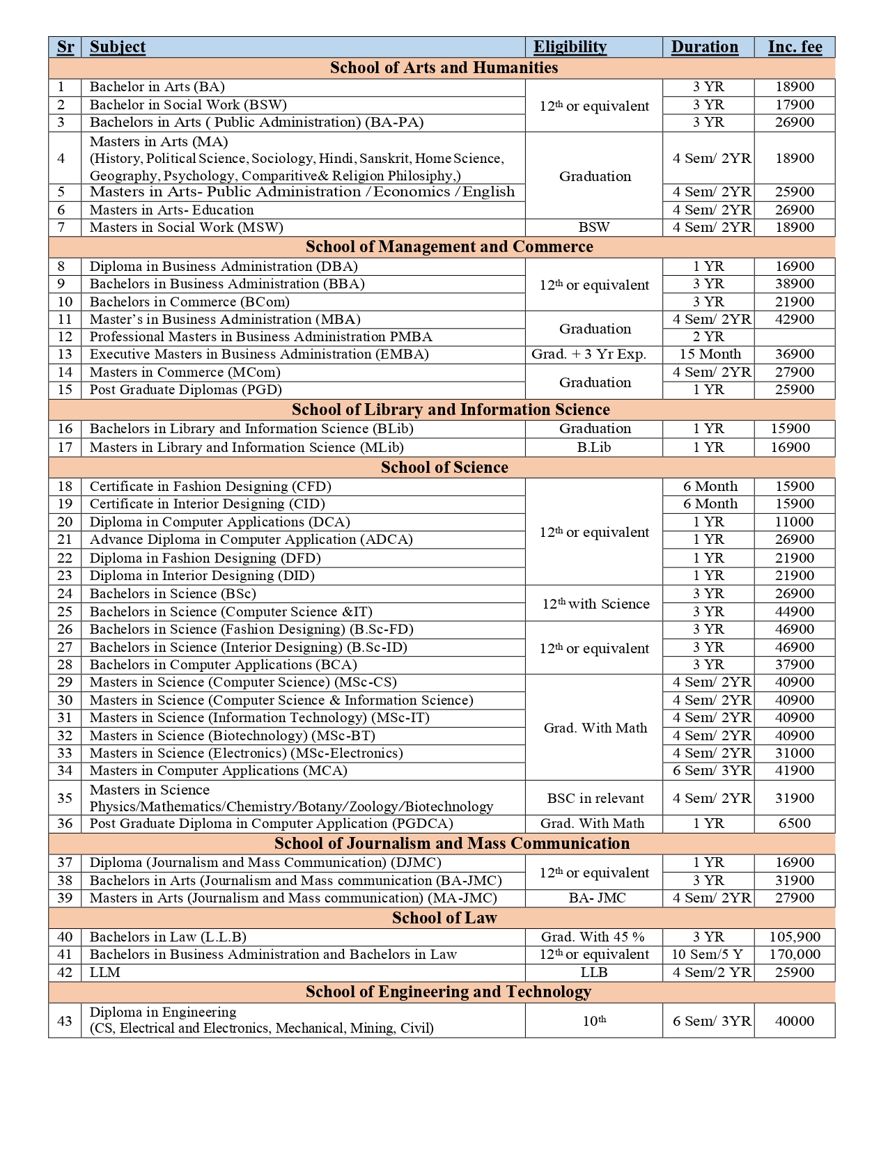 Course wise Fee Structure