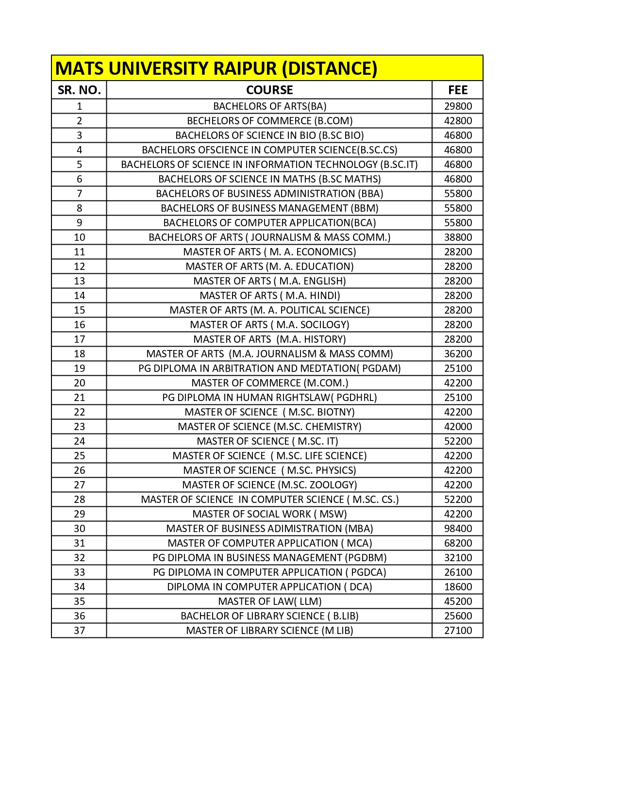 Course wise Fee Structure