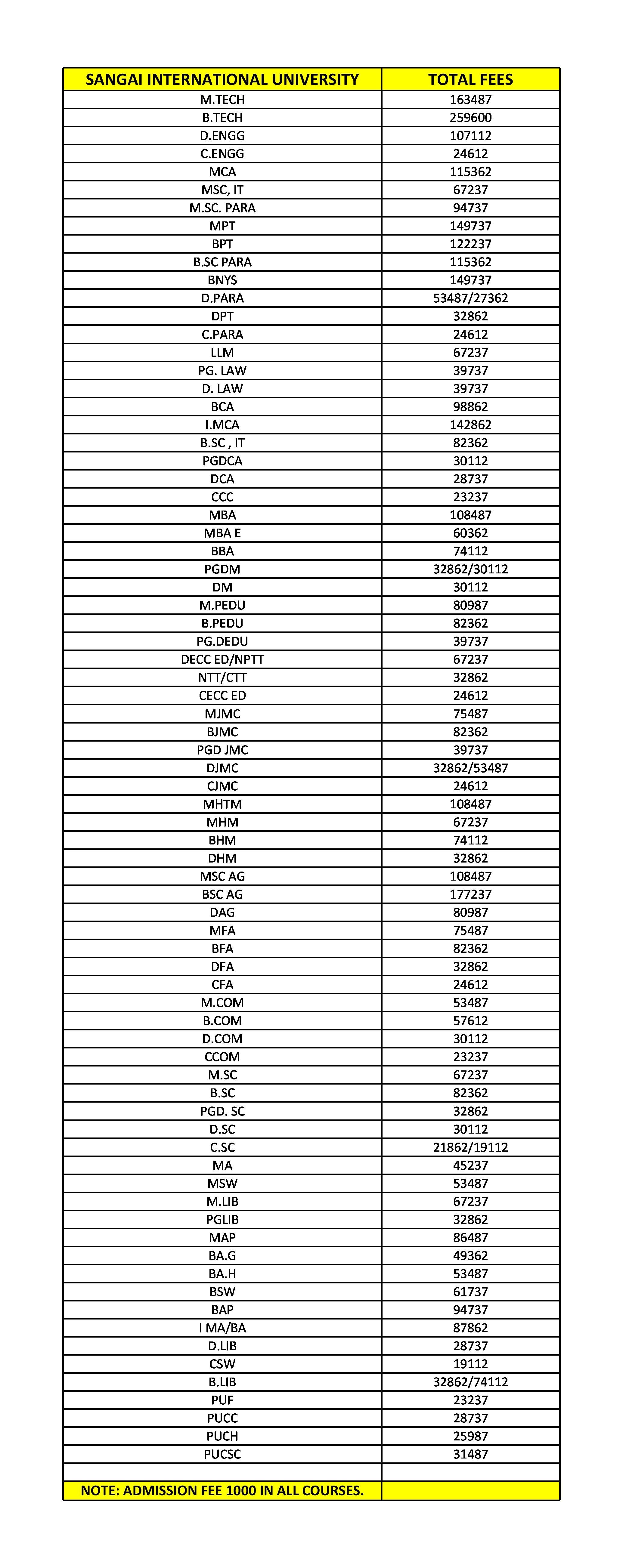 Course wise Fee Structure